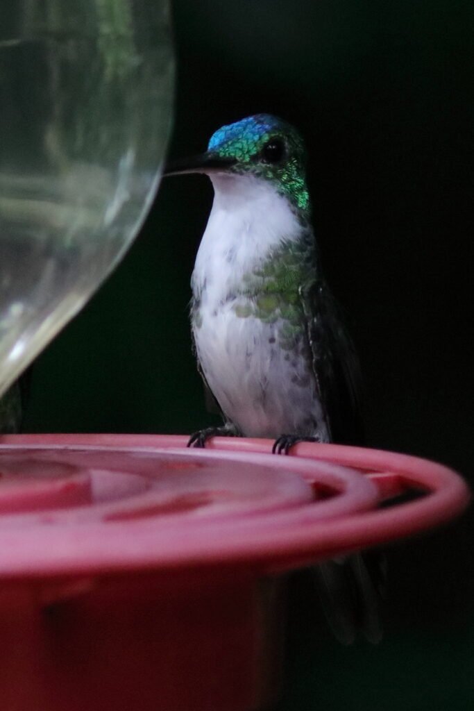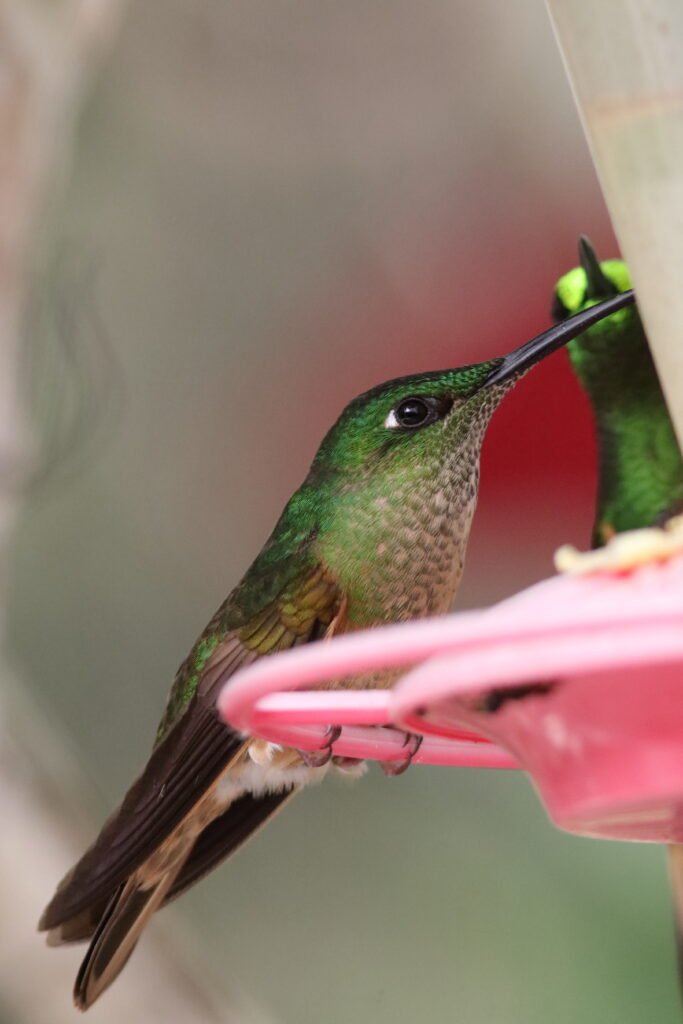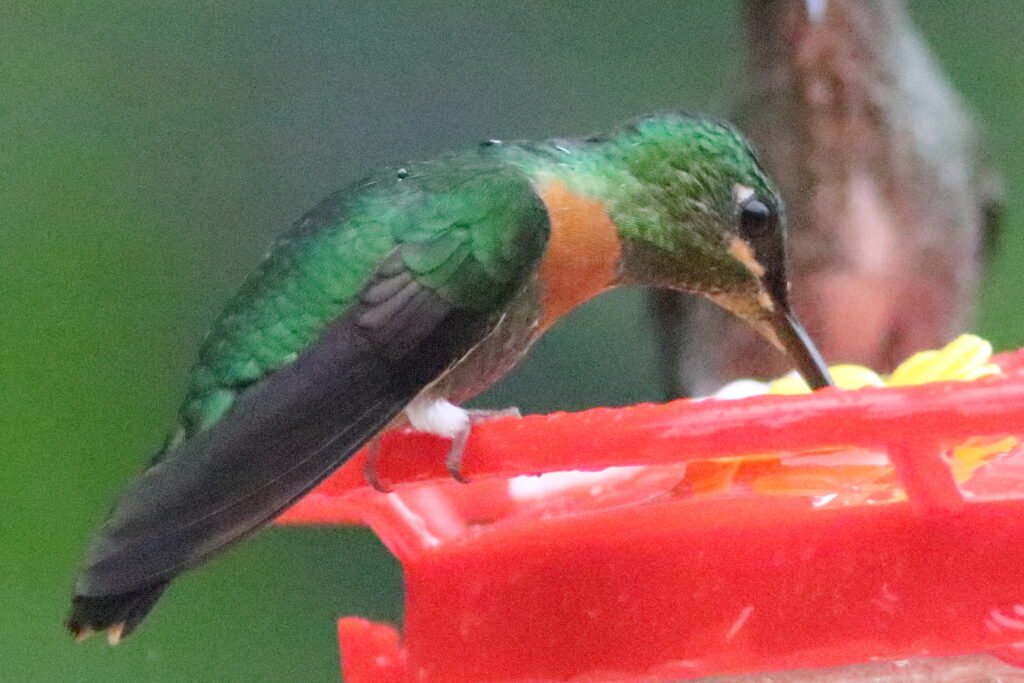 With the huge array of hummingbirds, we would find some quite plain and others stunningly beautiful. Some were big and some tiny. Some are aggressive and others docile. One species we found, and I was unable to photograph, was the Giant Hummingbird. Well named, this hummingbird clocks in about the same size as an American Robin. We only saw it in one area high up in the Andes Mountains. We never saw a Giant Hummingbird at a feeder.