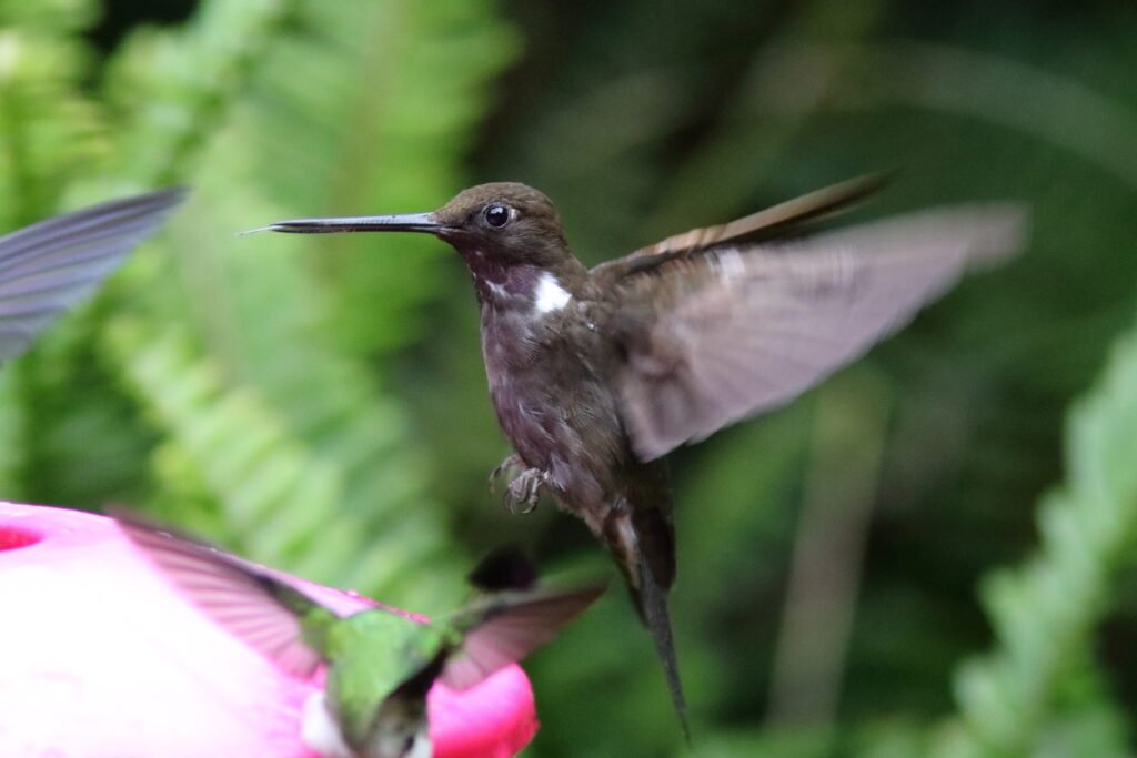 Collared Inca – A large and fast hummingbird with bold white tail feathers, the Collared Inca has a very long straight bill. The male (as in this picture) has a little purple at the nape of its neck. The female’ nape is green. I was unable to capture an image of the Bronzy Inca, but the Collared Inca likes it in higher elevations 5,400 to 9,000 FASL. The Bronzy Inca is below that and the Brown Inca is lower than the Bronzy. The three inca hardly ever are found in the same area.