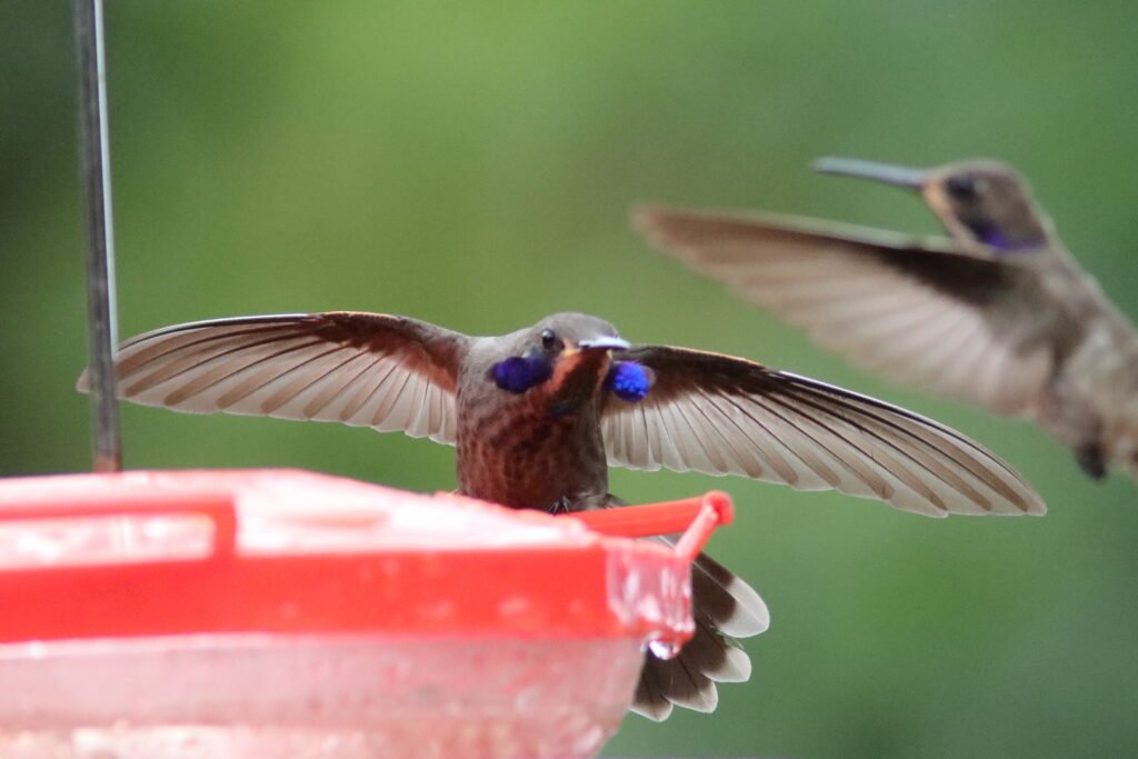 Brown Violetear – The Brown Violetear stands out for two reasons. One it is so plain with only the violet around the ears and the hard to see throat sparkles as the only bright colors. Second because they dominate a bird feeder, chasing all other hummingbirds away. All the Violet-ear’s have a threat display that include flapping out those purple feathers to make their head very large and threatening. It works.