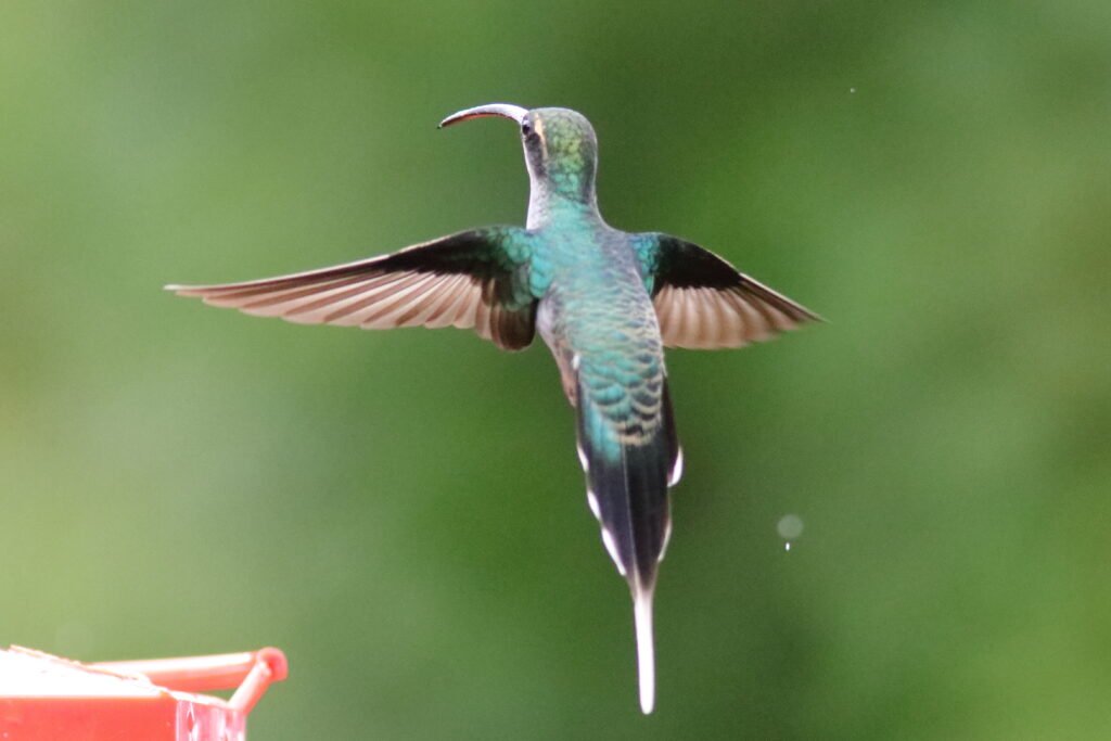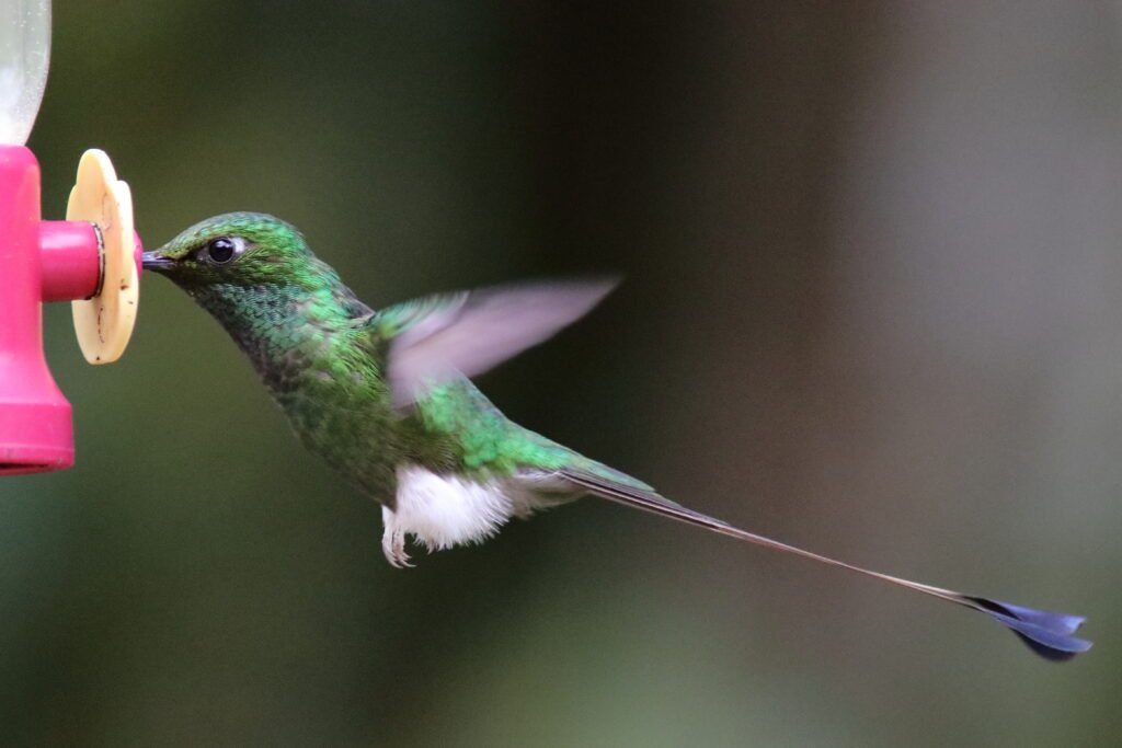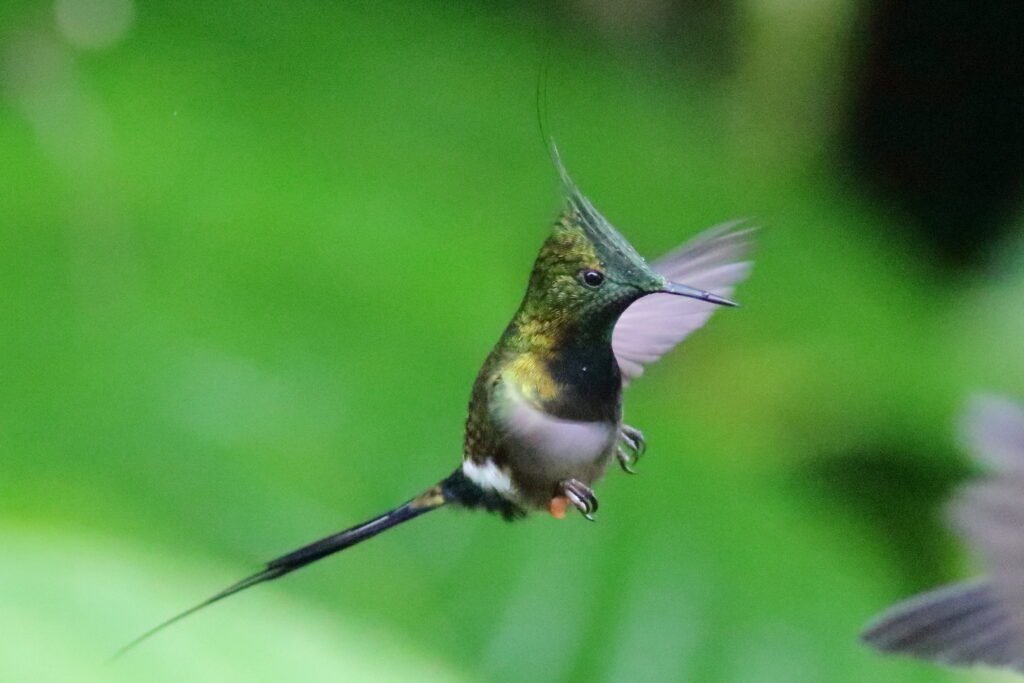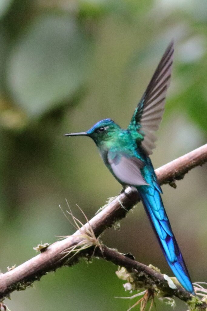 Green-tailed Trainbearer – Like the previous species, we found this in the high elevation of the hotel in Quito, but we also found it in the high elevation of Zuro Loma Preserve. As well as in Peru. A bird about 6 inches long, the tail makes up 4 inches of that length.