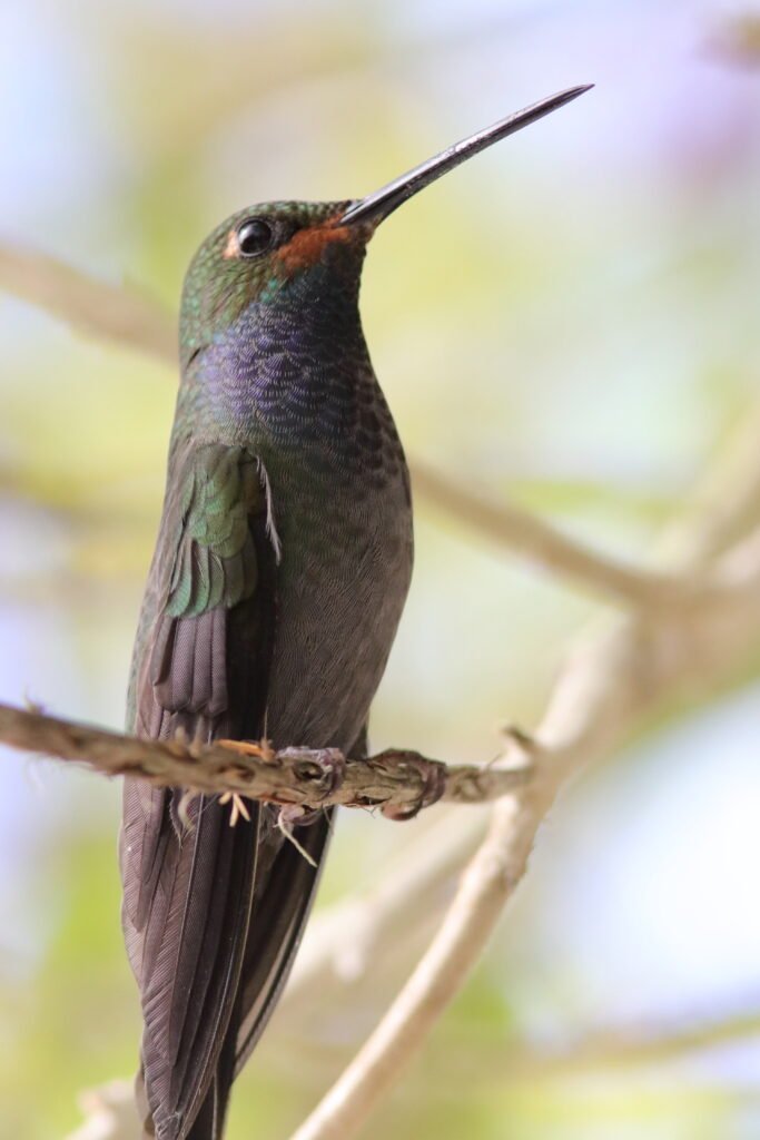 Gorgeted Woodstar – This may be the smallest hummingbird we found clocking in at just 2.5 inches. Sexually dimorphic, the breeding plumage male sports a bright magenta throat bordered by a white band over a green belly. The female breast is rufous. Being so small, they just dash in and out to feed as the larger hummingbirds frequently chase them.