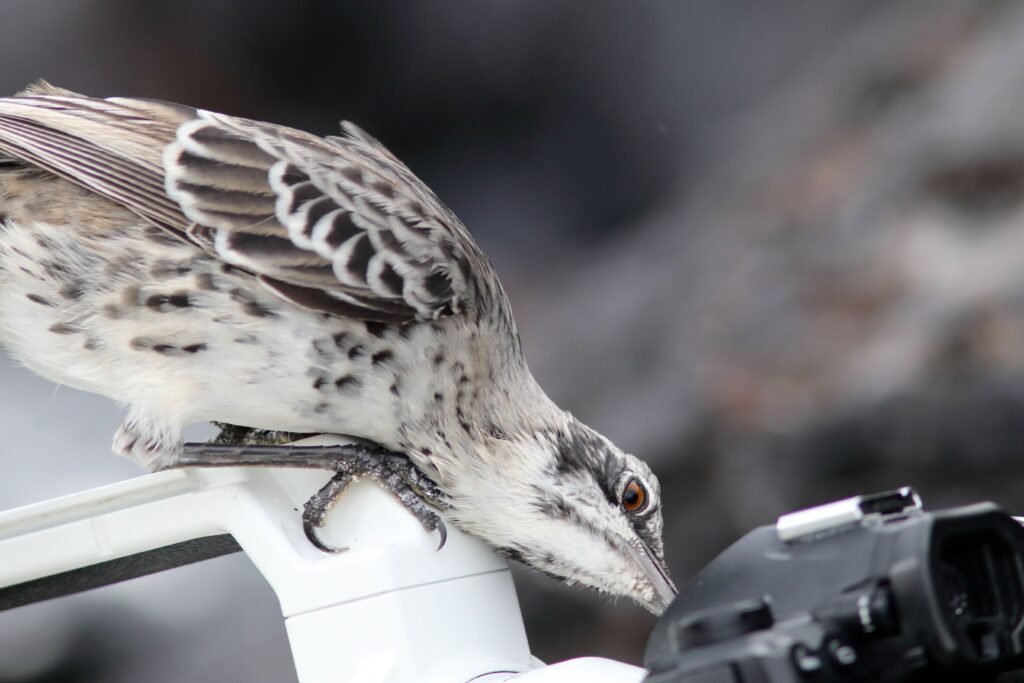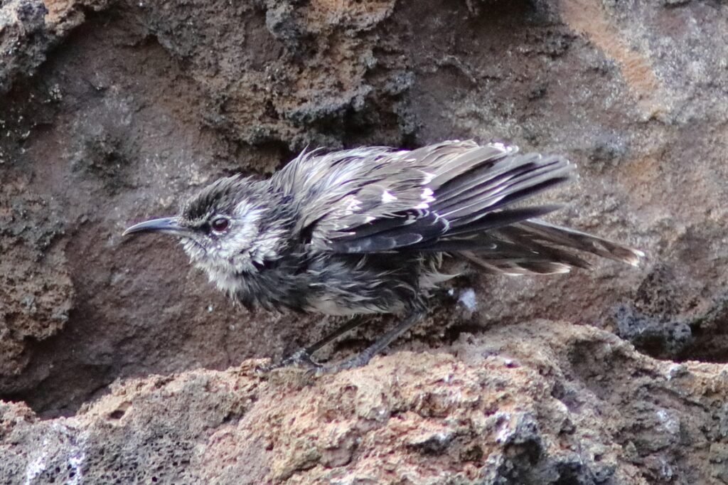 The rarest of all of the species is the Floreana Mockingbird. Originally Floreana contained many of these birds. By 1888 they were extirpated from Floriana. They had succumbed to rats, goats, and pigs which were introduced onto Floriana, one of the four inhabited islands. This species can only be found on two small island outcrops. We visited Champion Island where they think about 14 pairs survive. To protect the birds, we could not land on the island. A panga (zodiac) ride brought us up to the cliff face where this heavier, darker species with a hooded appearance as opposed to being masked lived. Three of them entertained us! Its chest has heavy dark patterns. To protect this and other species, the Ecuadorian Government has aggressively instituted an invasive species eradication campaign. Hopefully, someday this species can return to Floriana Island.