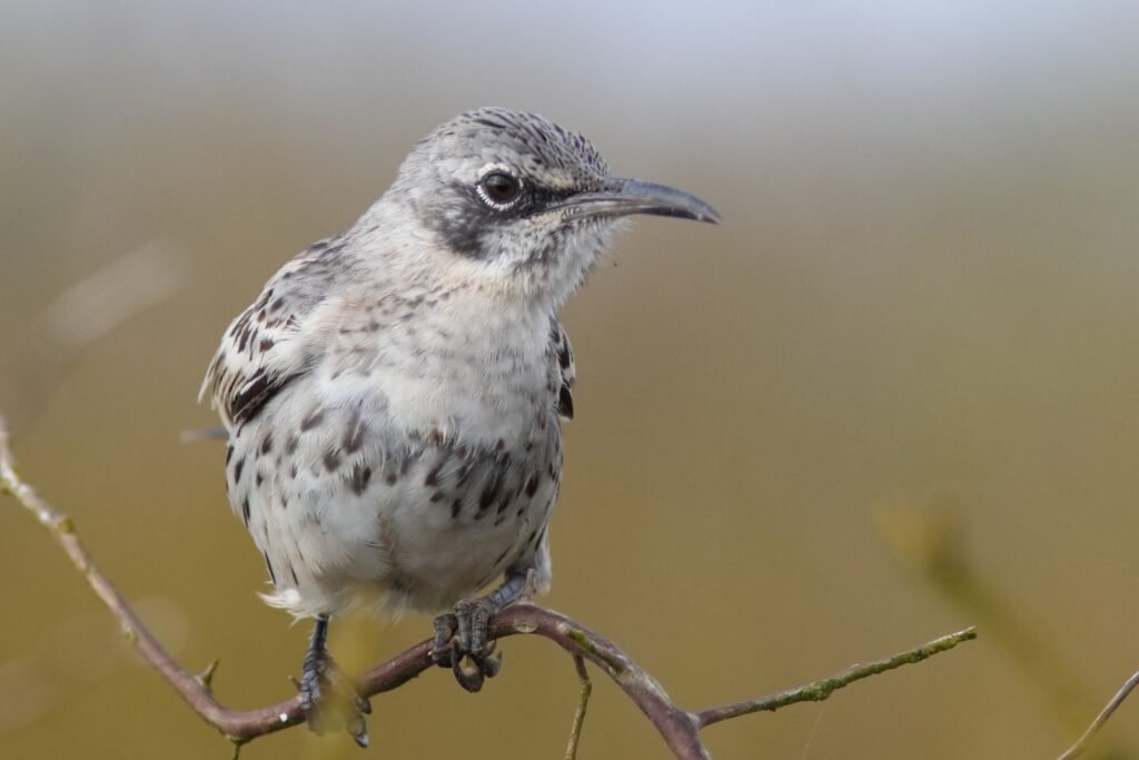 The Española Mockingbird, the largest of all of the mockingbirds, has more curvature to its stouter bill, a paler mask and crown with barring on the chest. It lives only on Española Island.