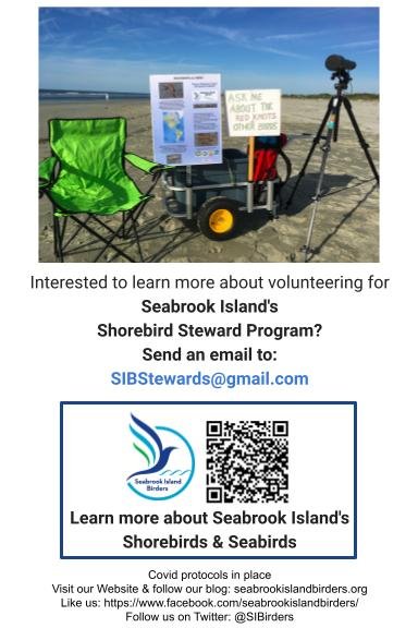 Seabrook Island Birders also is a dynamic organization that responds when issues that impact birds and their habitat arise. The club has established itself as a voice on Seabrook Island speaking about the importance of protecting birds. The Shorebird Stewards program works to educate people, both residents, and visitors, on the importance of protecting the habitat required for our resident shorebird population and for those groups of birds who depend on our beaches during migration and for nesting. SIB has also taken policy positions publicly on issues related to beach restoration and habitat preservation, this advocacy role adds a bird focused narrative to discussions on Seabrook Island.