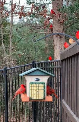 Apparently the birds heard the National Weather Service’s advisory of a Winter Storm Warning and Cold Weather Advisory. On Tuesday, the birds emptied my and many others’ feeders and anxiously awaited refills. My informal feeder watch had a record 20 species on Tuesday. Even though no snow was forecasted for Greenville, the Northern Cardinals swarmed Gina Sanders’ feeder.