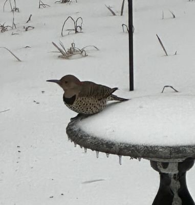 At 8:30, I saw this poor Northern Flicker trying to get a drink from my frozen bird bath. My accommodating husband went out and used hot water to remove the ice and refill. Jackie Brooks and Joleen Ardaiaolo also replaced the frozen water in their bird baths. Interestingly, the birds didn’t seem to come to our refreshed bird baths.