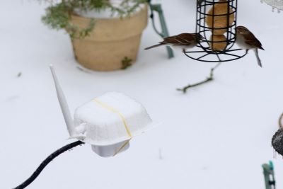 In preparation for inclement weather, Jackie and Walter Brooks creatively created a cover for their bird cam. It apparently survived the weather and continues to provide good pictures. My unprotected camera was all a blur until Dean trudged through the ice to clean the lens.