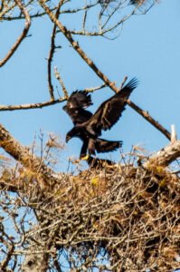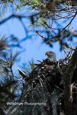 “I have an Eagle taking over an Osprey nest next to my house on The Haul Over. I hadn’t seen the Osprey last year sadly, then a few months ago, Madam Eagle was flying up and down The Haul Over with huge sticks, doing a rebuild/refresh on the nest. I do see her up there moving around but not every day and she’s quiet (unlike missy Osprey). I do see an Eagle on a dead tree on Marsh Hen and of course just assume she’s mine. Not sure about eggs but that might be why she could be low and quiet in the nest.”