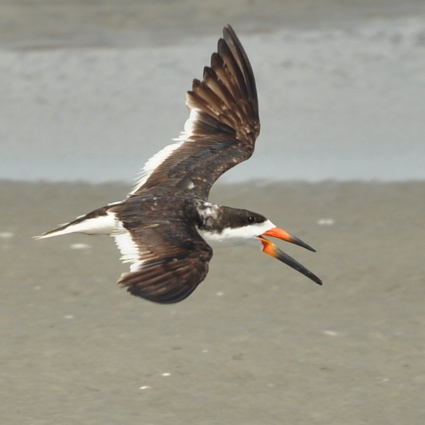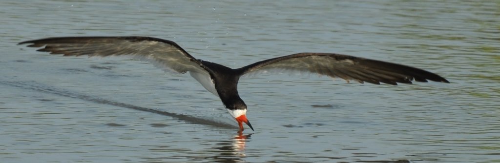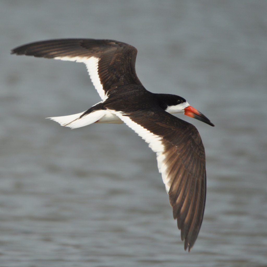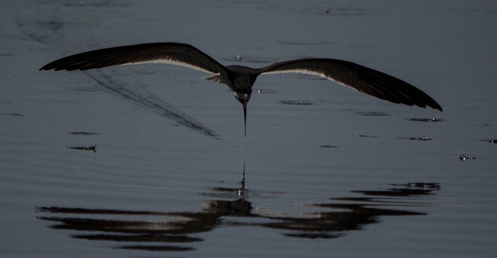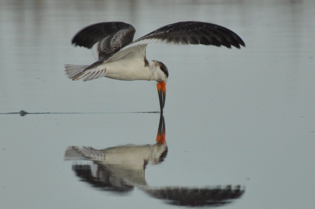 Aside from its striking black and white plumage, the Black Skimmer is memorable because of its eating style. It is the only bird in America with a longer lower beak than upper. It’s this special feature that enables it to skim the top of the water with its mouth open and the lower bill slightly submerged, feeling for small fish. When one is encountered, the upper bill snaps shut to capture its prey. Because the skimmer uses its sense of touch to hunt, it can successfully forage in all types of light, and even in the dark. That’s an advantage for us human observers since we can watch at any time of day and wonder at the skimmer’s incredible ability to remain a constant distance above the water, alternately gliding and propelling itself along.