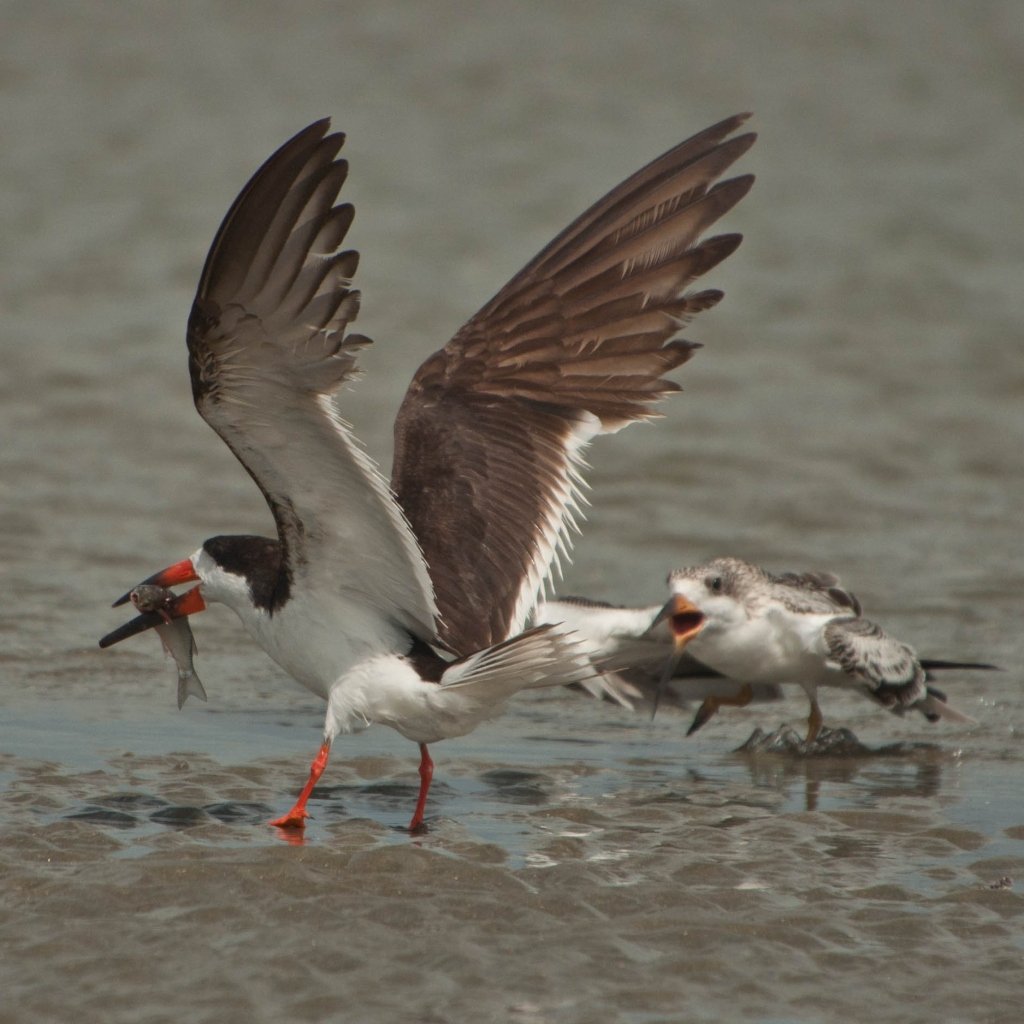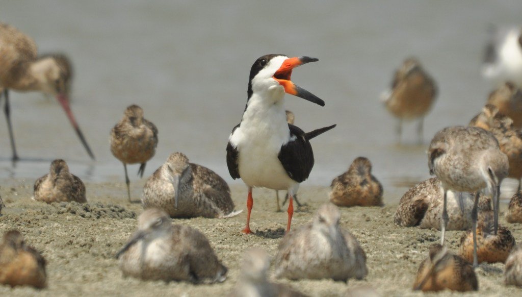 You will be able to pick out the skimmers on the beach in several ways. They are fairly large – 16-20″. They have a very long, low profile because of their short legs and long wings. Their wings actually extend beyond their tail feathers when they are on the ground and account for their relatively large wing span when flying. The sharp contrast of their black and white coloration and their bright red and black beaks also make them easily identifiable.
