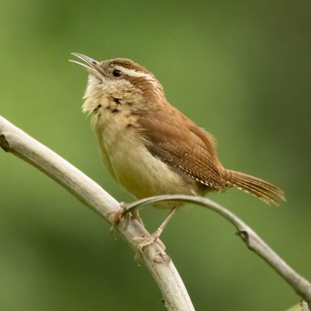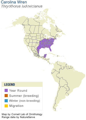 Only male Carolina Wrens sing—a series of several quick, whistled notes, repeated a few times. The entire song usually lasts less than 2 seconds and the notes are usually described as three-parted, as in a repeated teakettle. Each male has a repertoire of up to several dozen different song variations. He’ll sing one of these about 15 times before changing his tune. One captive male Carolina Wren sang nearly 3,000 times in a single day.