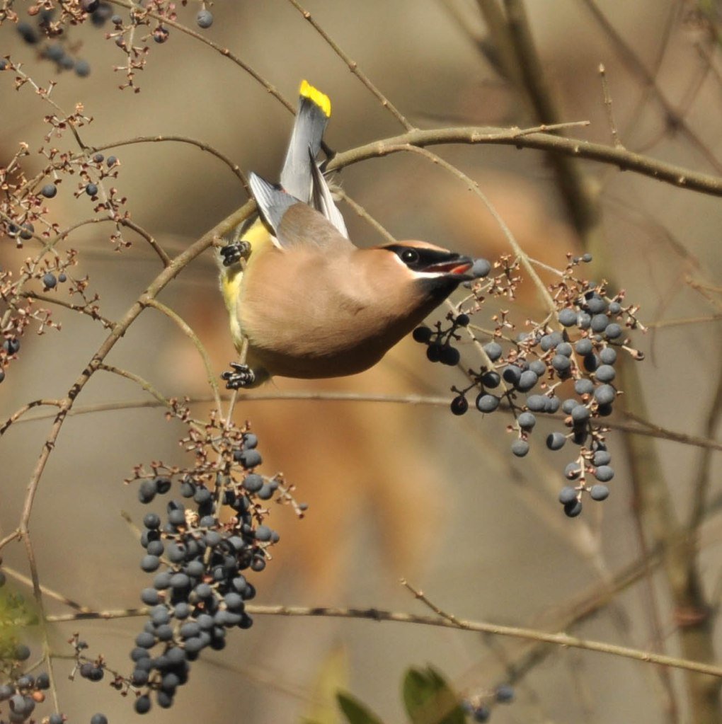 Cedar Waxwings are very sociable birds and almost always travel in flocks while in search of berries. Flocks of these birds will suddenly appear in an area, stripping trees and bushes of the berries and then vanish quickly when the crop is exhausted. In the winter and fall they feed on dogwoods, pokeweed, grape, mountain ash and apple. One of their favorite foods is a juniper called the Eastern Red-cedar. In the summer they eat strawberries, mulberries, cherries, blueberries, blackberries and honeysuckle. They also eat protein rich insects including mayflies, dragonflies, stoneflies and flower petals and sap. Their insect catching behavior mimics a flycatcher as they leap off branches to grab insects in flight.