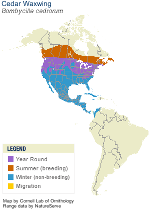 Cedar Waxwings inhabit deciduous, coniferous, and mixed woodlands and like to nest in brushy areas near streams. Scientists have discovered that Waxwings select mates of similar ages. During courtship males often pass a small item like a fruit, insect, or flower petal, to the female. After taking the fruit, the female usually hops away and then returns giving back the item to the male. They repeat this a few times until the female eats the gift.