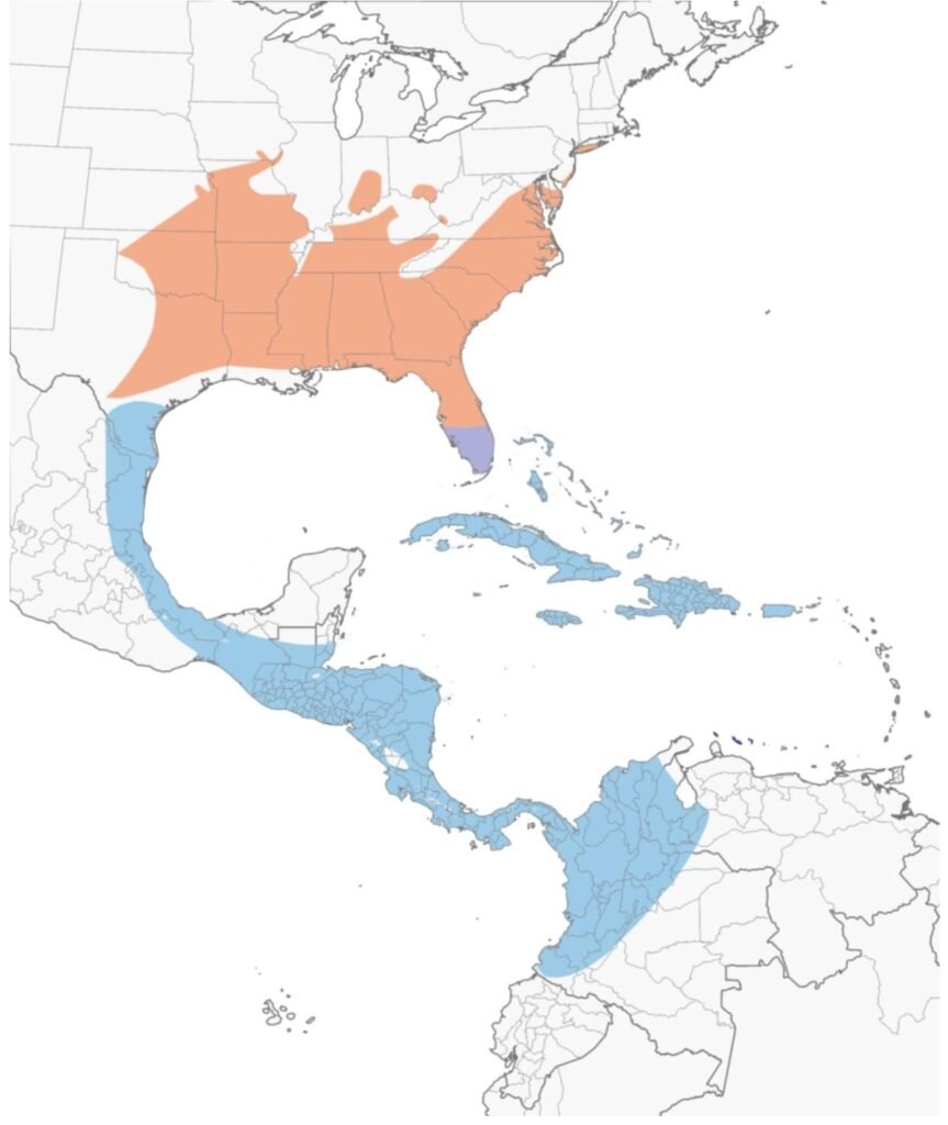 The Chuck-will’s widow has mottled brown plumage with a buff throat. It features reddish-brown feathers lined with black, and its head and chest display brown and white patterning. Males have distinctive white patches on their outer tail feathers. This bird has a short bill and a long tail, typical of nightjars. You are probably hearing the Chuck-will’s Widow song right now in the morning or all night long. If you are lucky and have a keen eye, by day they can be found resting motionless on the ground or on a horizontal branch.