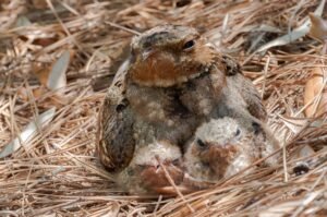 Chuck-will’s-widows don’t build nests; they simply lay their eggs on the ground among dead leaves, pine needles, or bare dirt. Incubating adults are incredibly well camouflaged and virtually invisible unless you nearly step on them. In the picture above, this chucks-will’s widow is sitting on a nest. She was just found recently on Seabrook Island Road at a private residence.