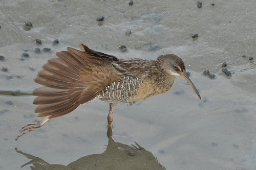 The Clapper Rail has a chicken-like appearance, with long unwebbed gray toes, strong legs and long slightly decurved bill. When it walks it twitches its short upturned white patched tail.  It has grayish brown upper-parts with vertical white-barred flanks, grayish cheeks and white throat.  Its eye color is red to reddish orange.  This bird is locally known as the Marsh Hen, Salt Water Marsh Hen and Mud Chicken.  Males are slightly larger than females but similar in coloration.