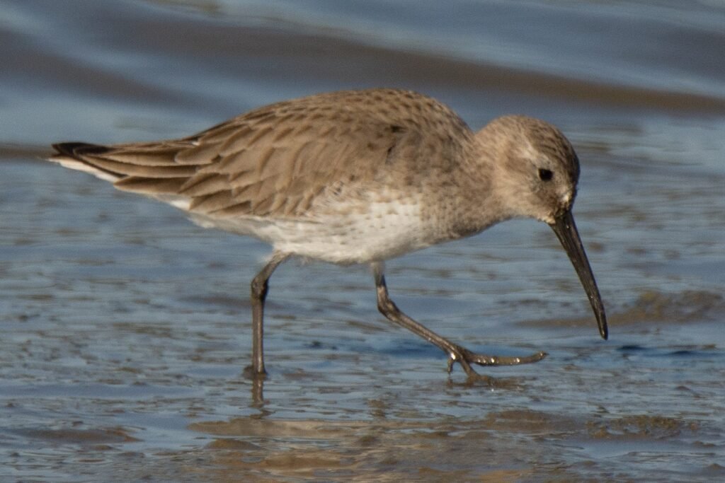 At 8.5″, they’re a medium sized shorebird, about the size of a robin. Their winter plumage is a dull brownish gray. Breeding adults have a black belly and a rusty, mottled back. They also have a long, drooping bill. They’re larger than a Western Sandpiper, but smaller than a Short-billed Dowitcher.