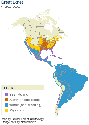 Standing over three feet tall, the Great Egret is the largest white bird within its range and is distinguished from similar birds by its large size, solid white plumage, yellow bill, and dark grey to black legs and feet.