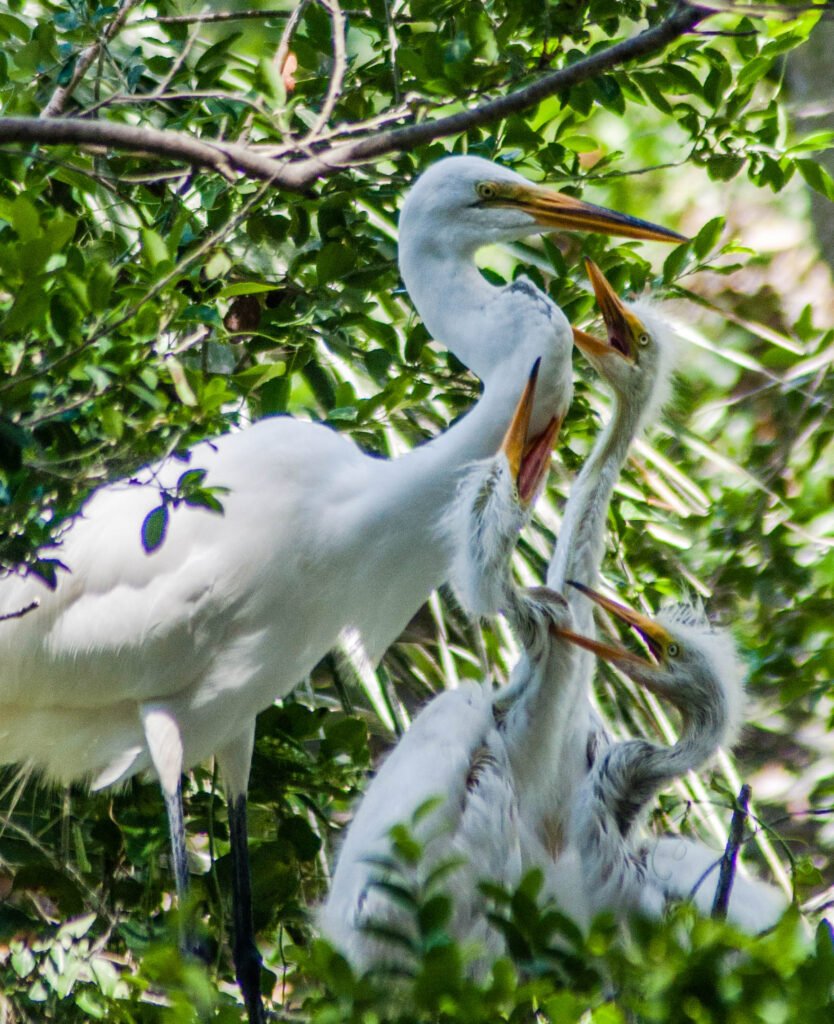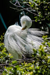 Adult Great Egrets have no predators and only crows, vultures, and raccoons are reported to prey on the eggs and fledglings. However, their beautiful plumage nearly resulted in their demise. Ninety-five percent of the North American Great Egret population was killed for feathers to decorate hats and other clothing items in the 19th century.