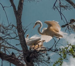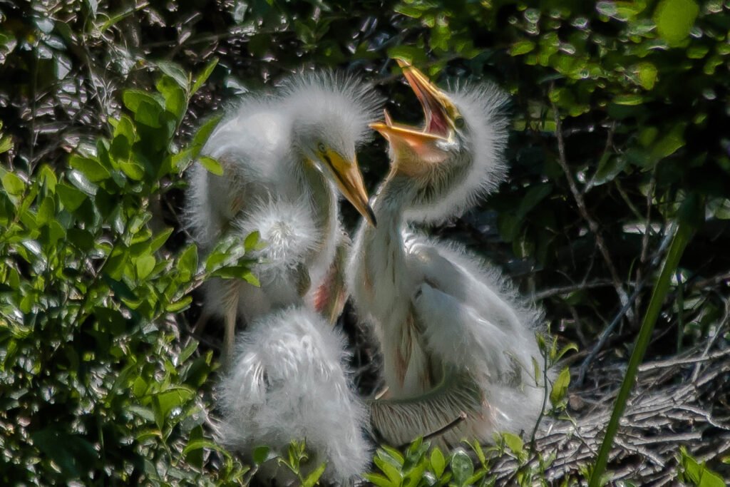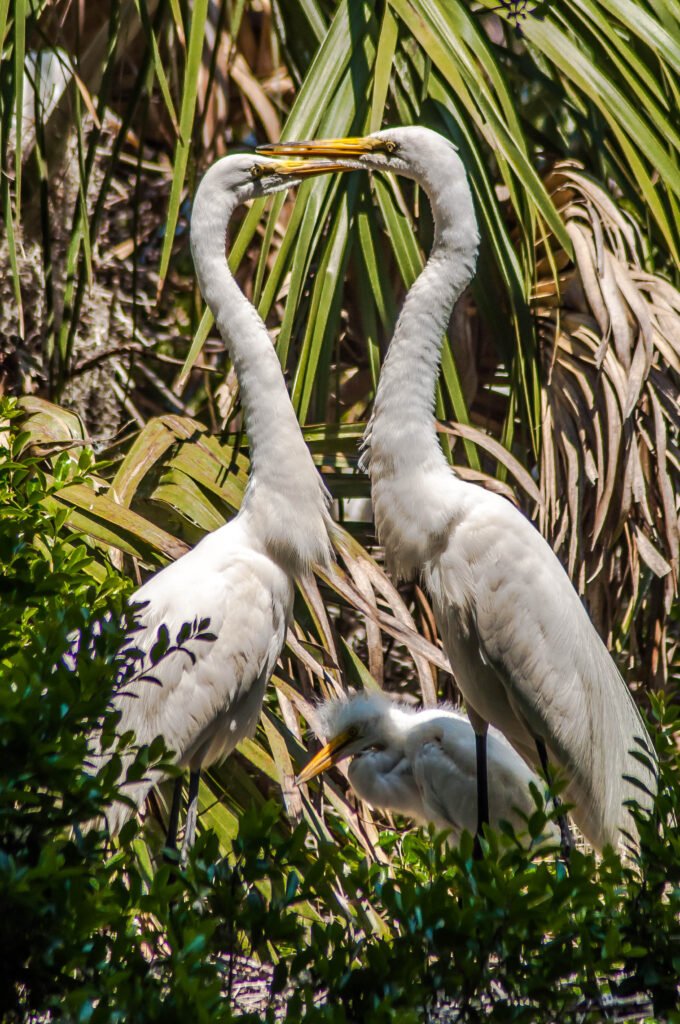 Males establish a territory, select a nesting site, begin to build a nest and initiate mating displays that attract females. Breeding plumage consists of numerous delicate ornamental feathers. The birds display these feathers by holding them up, puffing them out, and spreading them over their backs. At the same time they extend their neck skyward and pump it up and down several times. Great Egrets make dry, croaking sounds, nasal squeals, and other harsh calls. They are particularly vocal during breeding season as they go about establishing territories, courting, forming pairs, and maintaining pair bonds. You just might hear something that sounds like this near their rookeries around the island.