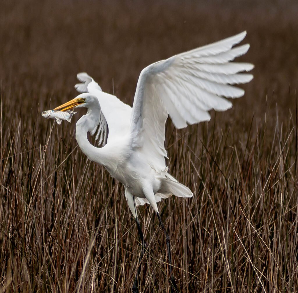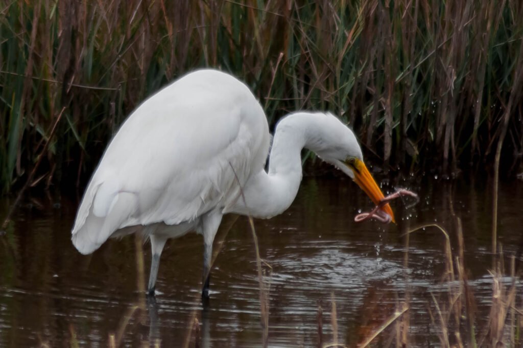 The neck of the Great Egret is extremely flexible and an adult bird can swallow a one-pound fish with ease, an amazing feat considering that on average adult birds may weigh just over two pounds themselves.