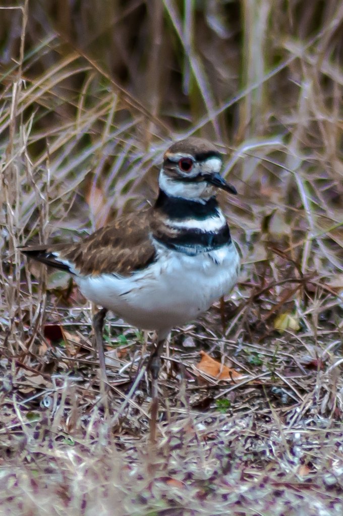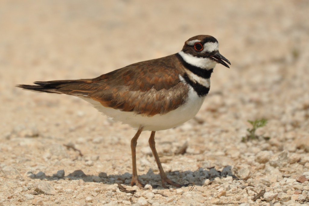 The Killdeer is easy to recognize with their double black neckband (that look like necklaces), rusty rump and white belly. It has a slim shape with long wing and tail feathers. It also has a bright red eye ring and thin beak.