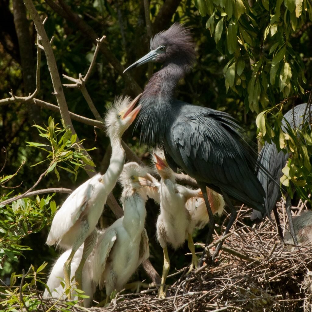 Little Blue Herons are gregarious breeders, nesting in bushes over or near water. During the spring and early summer, they are part of the flocks on Jenkins Point along with the ibises and egrets there. In its write-up on this species, Cornell Lab of Ornithology states, “A courting male points his bill straight upward, suddenly extending and retracting his neck. Little Blue Herons of both sexes, when courting, may occasionally grasp, pull, and shake branches while simultaneously erecting the feathers along their head, neck, and back…. Little Blue Herons and neighboring colonial birds have a pronounced impact on their nesting habitat—stunting the growth of vegetation by harvesting nest material and sometimes killing trees outright by the accumulation of guano.”  This is true on Jenkins Point.