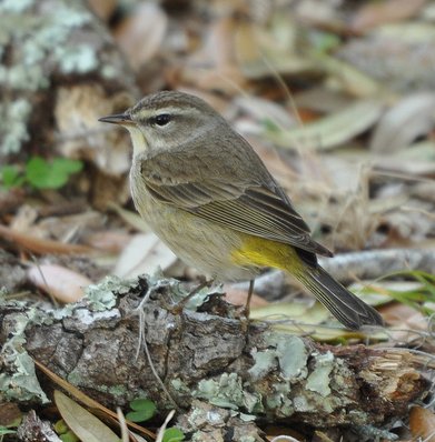 The Palm Warbler is one of the wood warblers. It is fairly common on Seabrook in the fall and winter months. The most obvious field mark is its tail-wagging habit. Although it is a rather dull olive on its back, as it wags, it shows its brighter yellow underparts. You also might pick up the soft striping on its breast and sides. The male sports a rusty-colored cap in its breeding plumage although we would be less likely to see that here because it does not breed here.