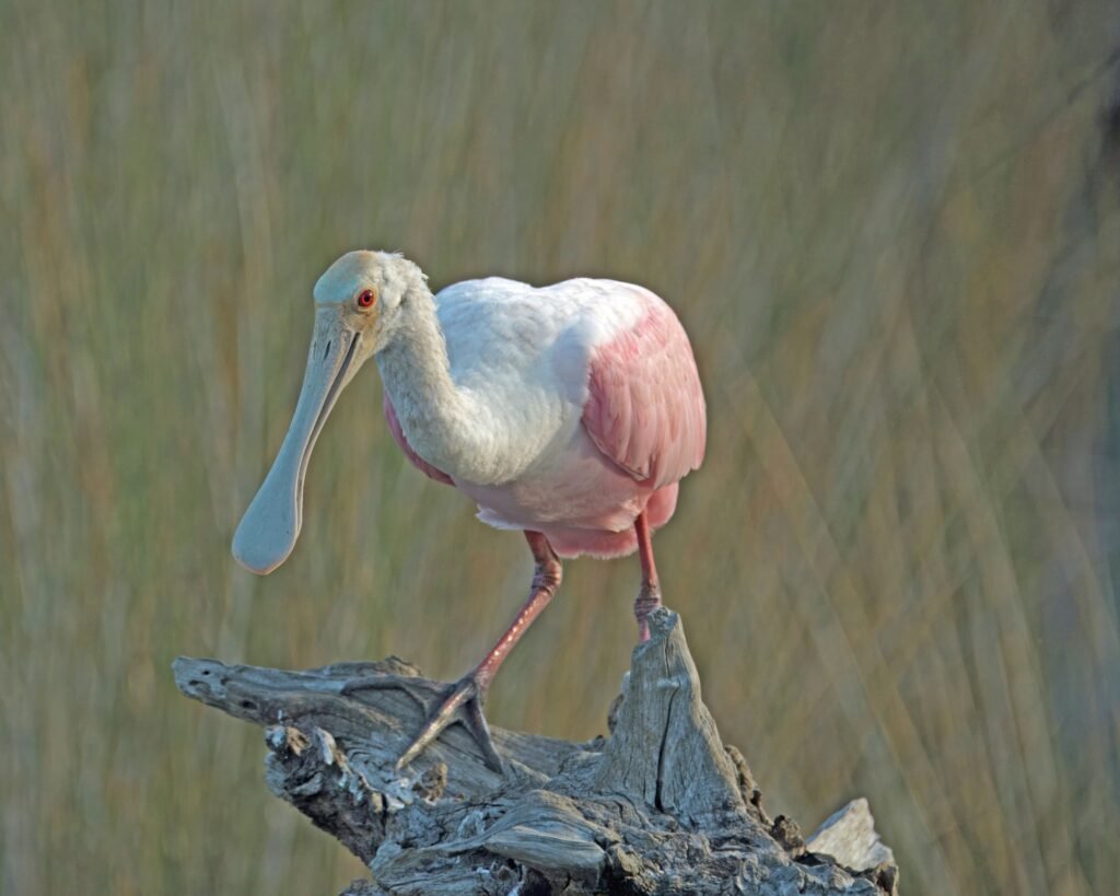 Spoonbills are very social birds and spend most of their time with other Spoonbills or in the company of other wading birds.  It is an unusual looking large wading bird with pink plumage, a long flat grayish spoon-shaped bill and an un-feathered greenish gray colored head which becomes golden buff during breeding. The neck, chest and upper back are white and the adult has beautiful red wing coverts. They have long red legs adapted to walking and wading in wetlands. They also have red eyes. Their nostrils are located at the top of the bill, making it possible for the bird to breathe while the bill is under water.
