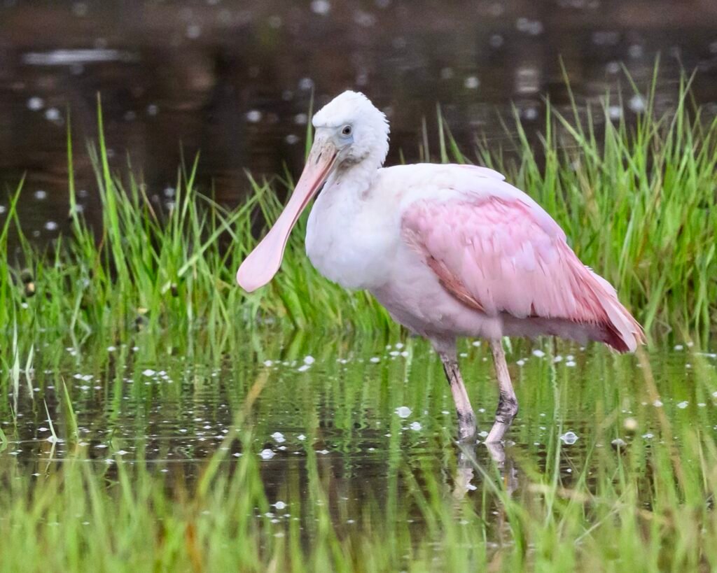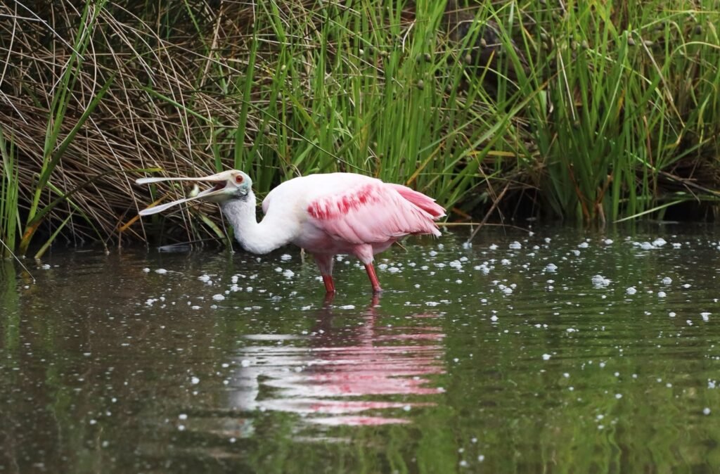 The next time you see a Roseate Spoonbill, check out the long, flat, spoon shaped bill. Spoonbills feed by walking in shallow, muddy bottom water and tidal ponds foraging by sweeping their bill from side to side with it slightly open to sift up small fish, shrimp, mollusks and snails. To locate prey, Roseate Spoonbills have sensitive nerve endings and touch receptors in their bill, which they then snap closed to pull the prey out of the water. Similar to flamingos, Roseate Spoonbill’s pink color comes from the food it eats.