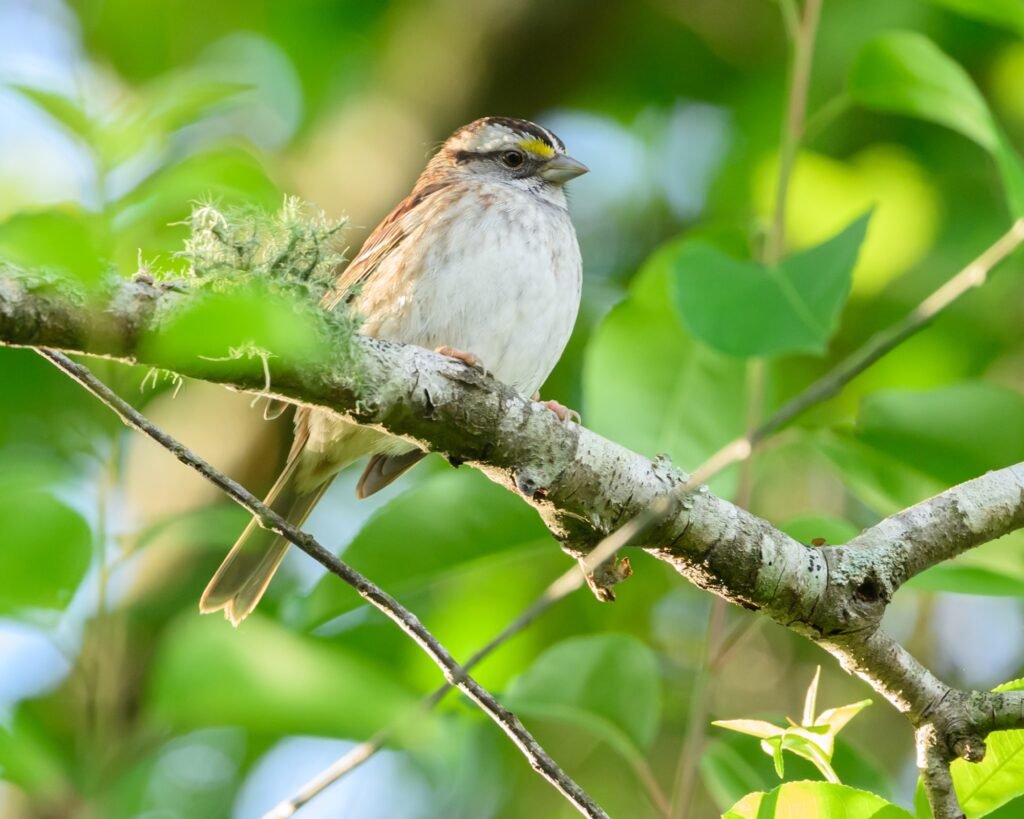 According to Cornell Lab All About Birds: “Crisp facial markings make the White-throated Sparrow an attractive bird as well as a hopping, flying anatomy lesson. There’s the black eyestripe, the white crown and supercilium (eyebrow), the yellow lores, the white throat bordered by a black whisker, or malar stripe. They’re also a great entrée into the world of birdsong, with their pretty, wavering whistle of Oh-sweet-canada. These forest sparrows breed mostly across Canada, but they’re familiar winter birds across most of eastern and southern North America and California.”