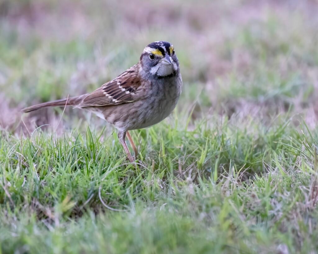 “White-throated Sparrows hop when they’re on the ground rather than walking or running. They forage in the leaf litter, often using both feet at once to scratch backwards, then pounce forward at anything they’ve uncovered. They also toss leaves aside with flicks of the head. During the breeding season the males are aggressive, chasing each other off their territories.”