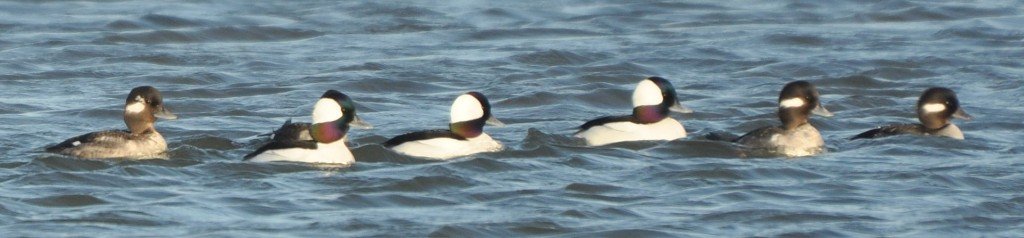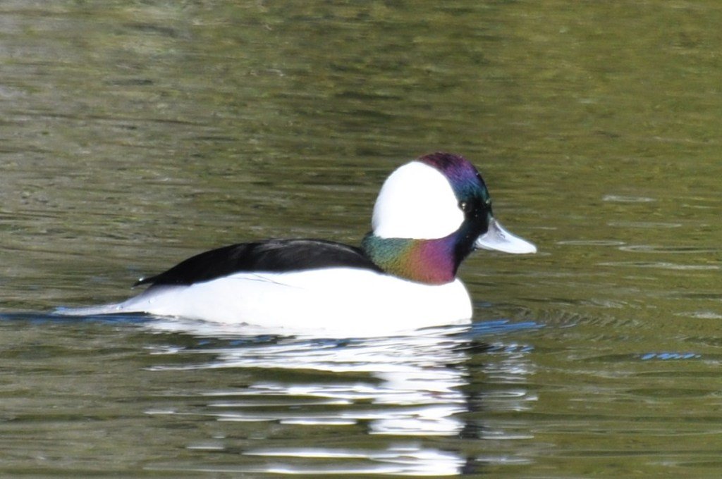 The Bufflehead also has a striking male and a plain female. The male has a large head with a big white-wedge patch. It is a small (14″) squat duck and the head looks oversized.  The remainder of the head looks black, but if you look carefully it is an iridescent green/purple. It is mostly found in coastal bays (the old cut area had 2 last week) but can also be found on lakes. The sides of the male are clear white, whereas the Hoodie is brown. The female is a plan gray/brown with a distinctive white patch on it’s cheek.