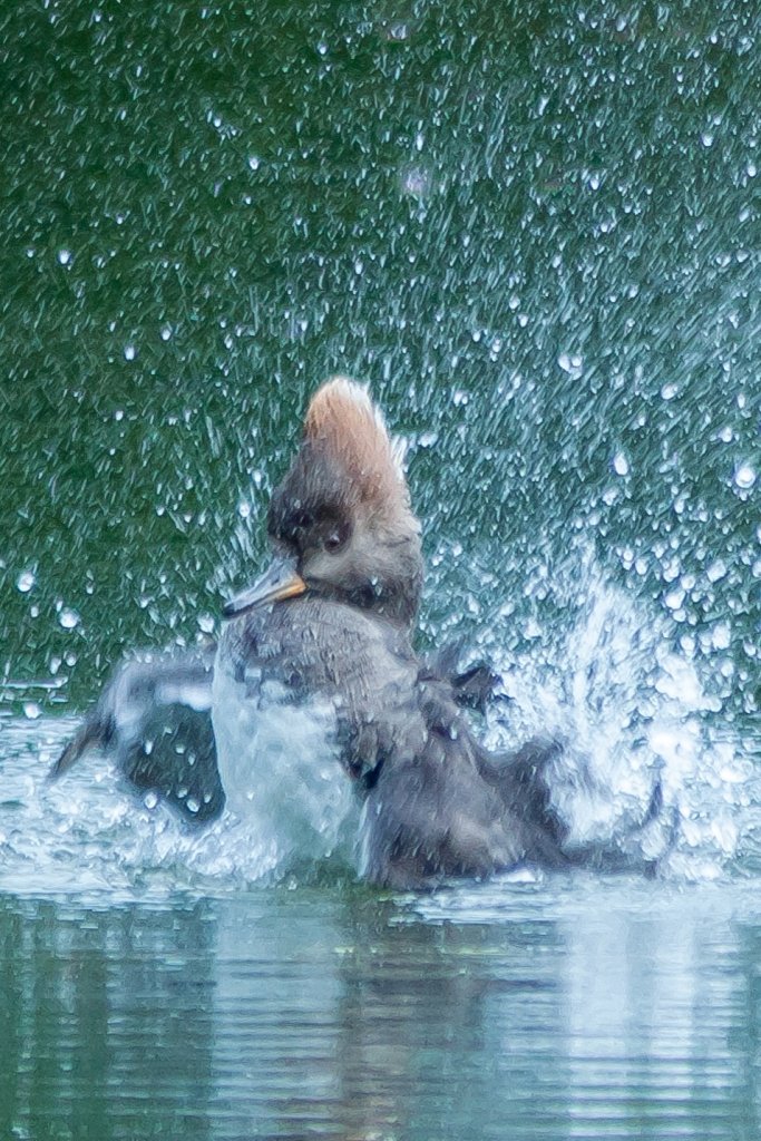 The Hooded Merganser is one of our most beautiful ducks. The male “Hoodie” has striking white on the head , a black back and it’s sides are coffee brown with two black vertical lines, or “spurs,”that cut diagonally through the white breast. In courting behavior, which begins mid-winter, the males flare their crests, and the females “head-bob and pump.” The female is a chocolate brown and very plain, but I think very classy! When I was researching this article, one source online said “it looks like she blow dried her hair in a jet engine,”because of the swept back crest. HA!