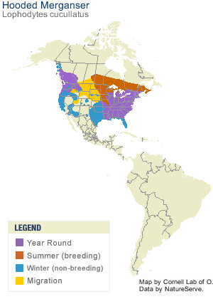 Hooded Merganser  Lophodytes cucullatus L: 18″, WS: 24″ WT: 22.4 oz.