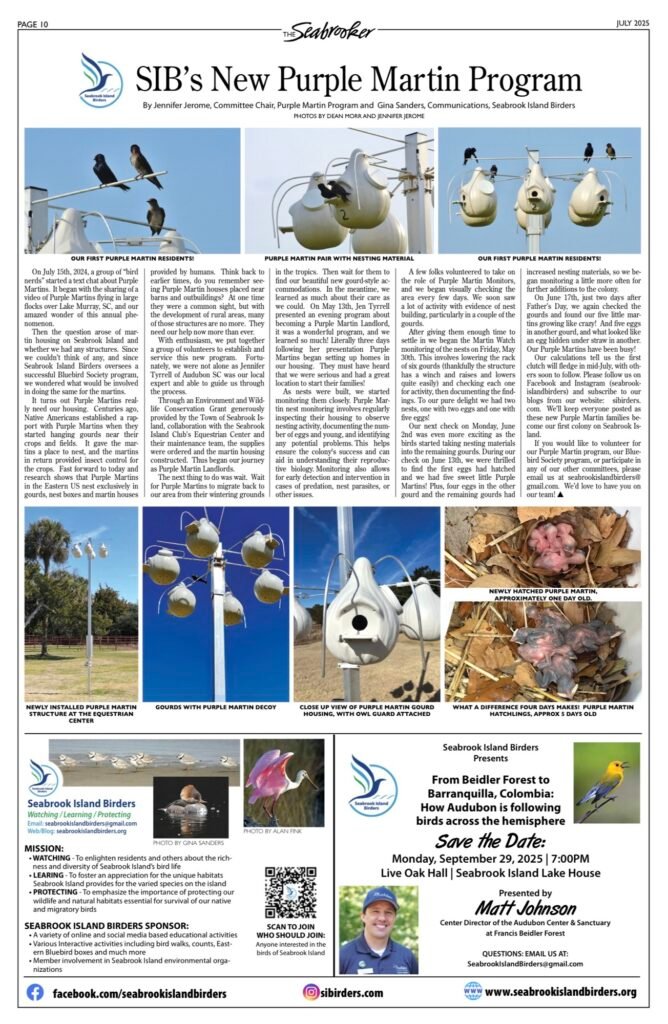 In case you don’t receive it, or haven’t had a chance to read it yet, we hope you will enjoy The Seabrooker’s July 2025 SIB article. Seabrook Island Birders (SIB) contributed a full page article on Page 10!