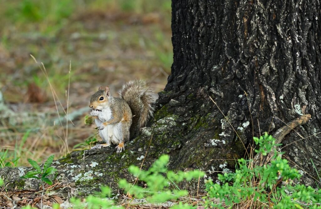 Chompy is a squirrel who has taken possession of a small area under the two feeders. He got his name because he’s usually chomping on something. He doesn’t allow birds or other squirrels in his area when he’s there, but fortunately it’s okay for the birds to walk around and eat a few inches away. It’s very interesting to watch what he does if one gets too close. He stops eating and stares at it. If it doesn’t walk away quickly or fly off, he makes a move toward it, and it definitely hurries off then. When other squirrels get too close he usually chases them across the yard. Then he scampers back to his area and starts eating again.